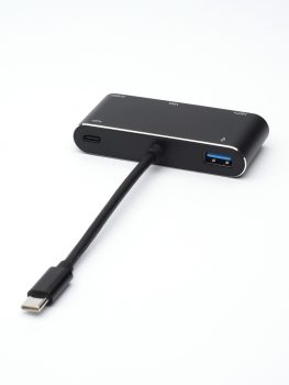 Mit diesem Adapter können Sie das Tonwiederherstellungsgerät anschließen. Außerdem gibt es einen USB3.0-Anschluss zum Anschluss externer USB-Geräte, während Ihr Gerät, das Videoinhalte überträgt, zu keinem ungünstigen Zeitpunkt entladen wird, da der Adapter über einen separaten Anschluss zum Laden verfügt das Gadget über den Typ-C-Anschluss (Pinsel).